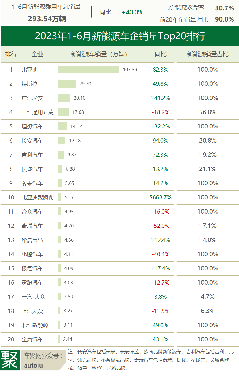 从增长率来看,6月新能源同比增长30%,远高于全体乘用车的1.8%。换句话说,纯燃油车同比下跌了8.1%。这一冷一热,最终结果是乘用车微增长。 2023年1-6月,新能源累计销售293.54万辆,同比增长40%,渗透率为30.7%,比去年同期上升7.8个百分点。