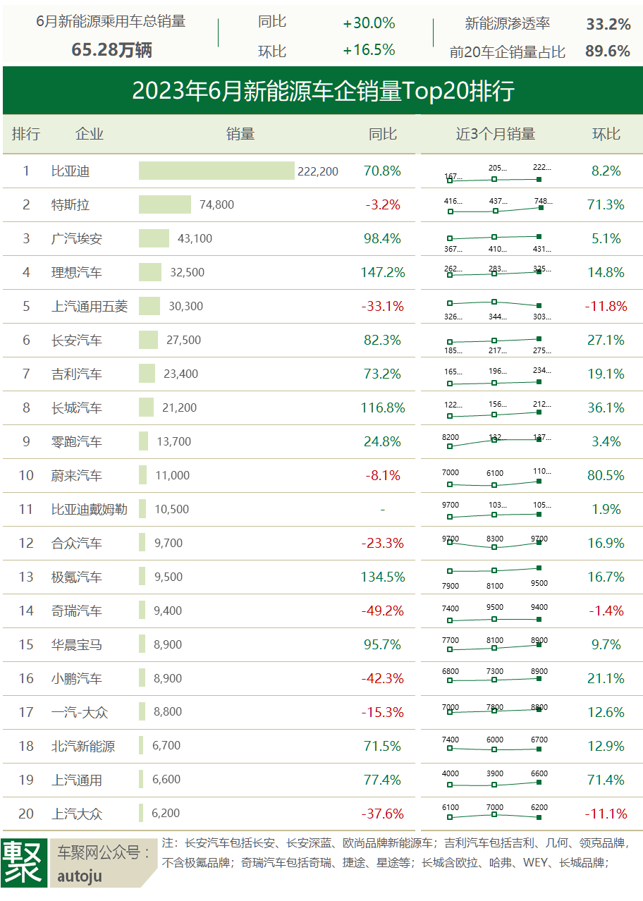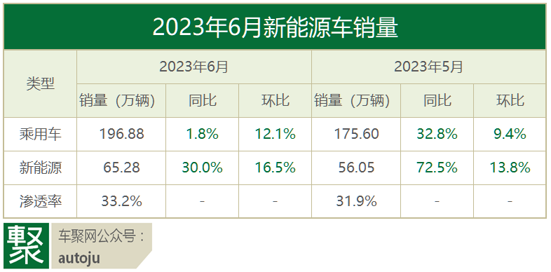 6月上险数显示,当月乘用车销量196.88万辆,其中新能源占65.28万辆,渗透率为33.2%。相当于,新能源车已占新车销量的1/3。