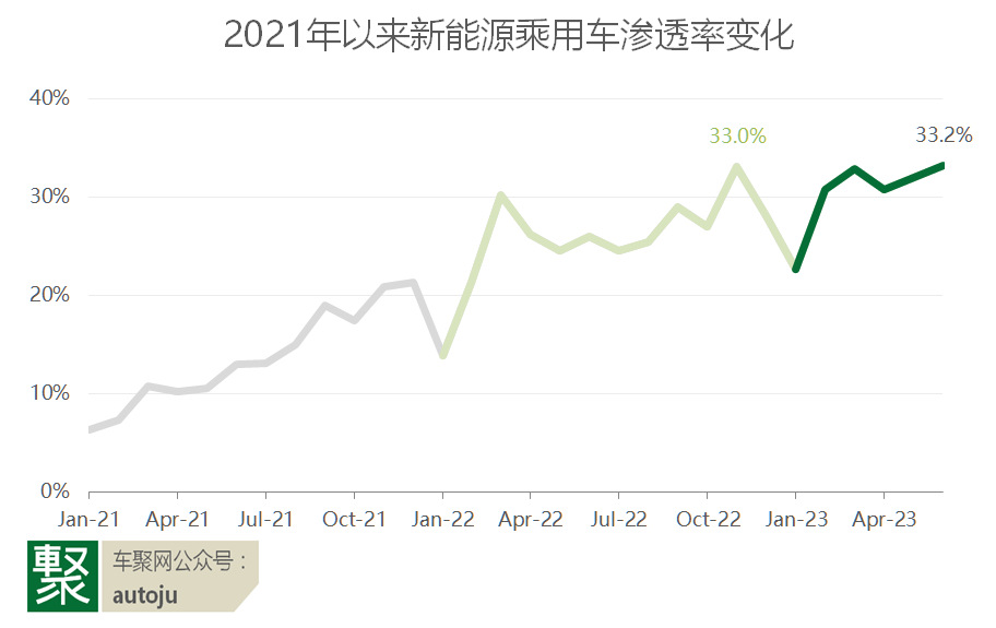 回看2021年以来每月的新能源渗透率,从最初的个位数一直增到2022年底的33.0%,到今年6月又创新高至33.2%。
