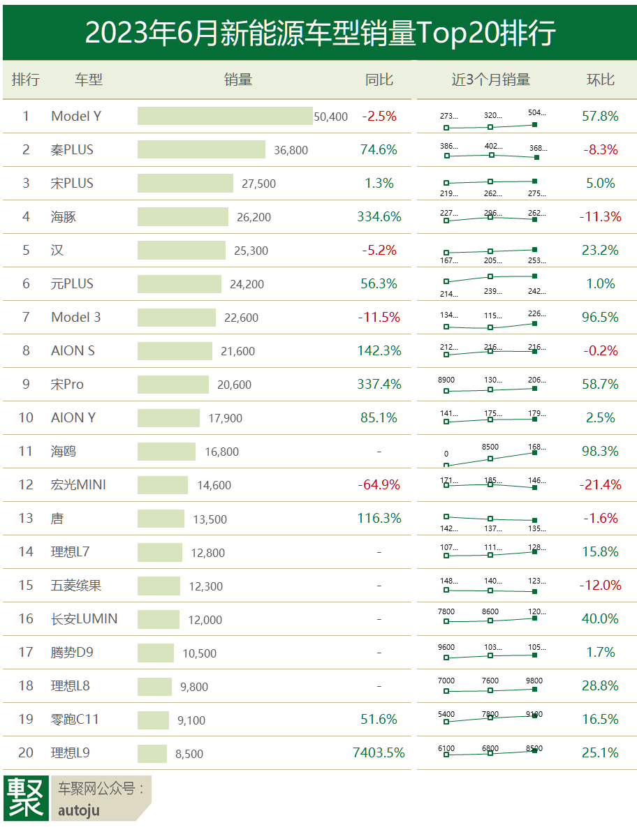 从6月新能源市场的单个车型来看,Model Y以5.04万的销量夺冠。虽然环比大增57.8%,但同比微跌了2.5%。可能,市场对其降价有了一定预期? 第二到第六名,全是比亚迪一家的。秦Plus以3.68万列亚军,宋Plus以2.75万列季军;海豚、汉、元Plus均以2万多销量霸榜。