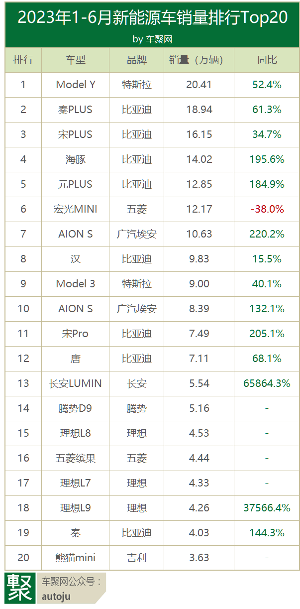 这是上半年新能源车型销量前20名。Model Y以不到1.5万辆的微弱优势,力压秦Plus夺冠,成绩是20.41万辆。这意味着它平均月销3.4万辆,不愧为新势力的鼻祖和标杆。 之后的榜单,基本是比亚迪家族屠榜,没什么新鲜的。