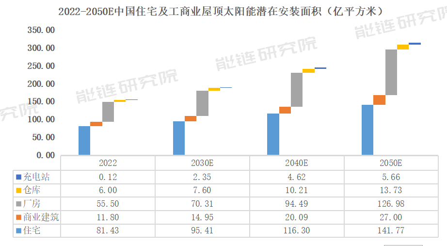 综上,同时考虑到中国城市化进程以及经济增长预期,假设住宅建筑面积以2%复合增长,商业建筑、厂房、仓库建筑面积以3%年复合增长率提升,按照四类建筑层数7、5、2、1换算屋顶面积,加上充电站这一核心分布式光伏场景,2050年至少潜在光伏安装面积为315亿平方米。
