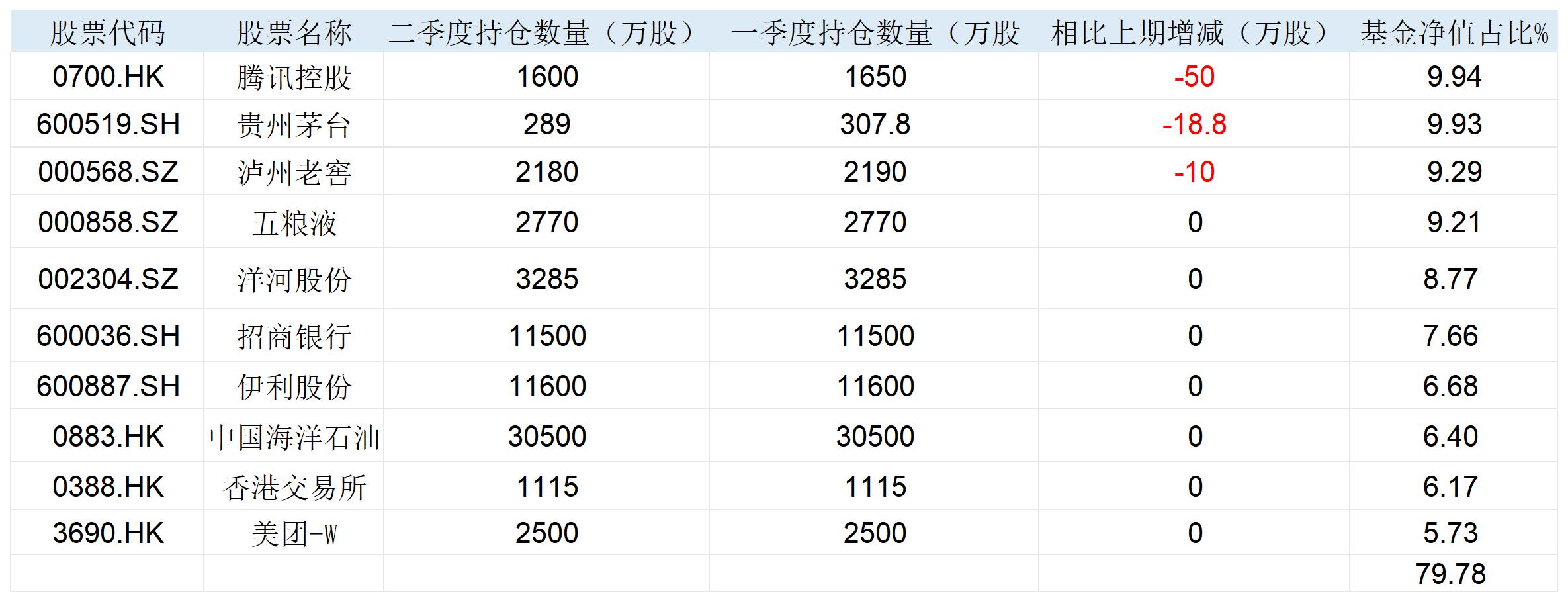 以规模最大的易方达蓝筹精选为例,二季度,腾讯控股(0700.HK)、贵州茅台(600519.SH)、泸州老窖(000568.SZ)相比一季度分别减少了50万股、18.8万股、10万股,但三只个股占基金净值的比例仍位列前三,分别为9.94%、9.93%、9.29%。其余7只个股的持仓数量则保持稳定。
