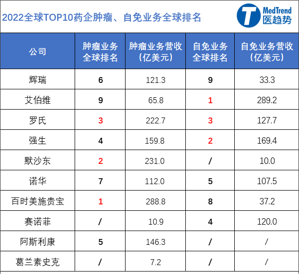 肿瘤、自身免疫是全球各大药企的必争之地,以此二者为例,按2022年营收来看: