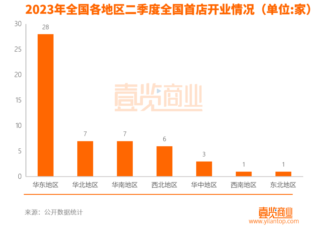从区域来看,华东地区依旧是首店集中地,第二季度以来共有28家品牌首店落地华东,占二季度开店总量52.8%,而后依次是华北地区7家,占比13.2%;华南地区7家,占比13.2;西北地区6家,占比11.3%;华中地区3家,占比5.6%;西南地区1家,1.8%;东北地区1家,1.8%。