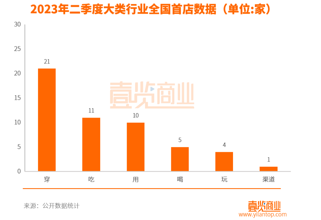 从大类行业来看,穿类行业第二季度全国首店开店数量最多,开业21家,占第二季度39.6%,而后依次是吃类品牌,开店11家,占比20.7%;用类品牌,开店10家,占比18.8%;喝类品牌,开店5家,占比9.4%;玩类品牌,开店4家,7.5%;渠道类品牌,开店2家3.7%。