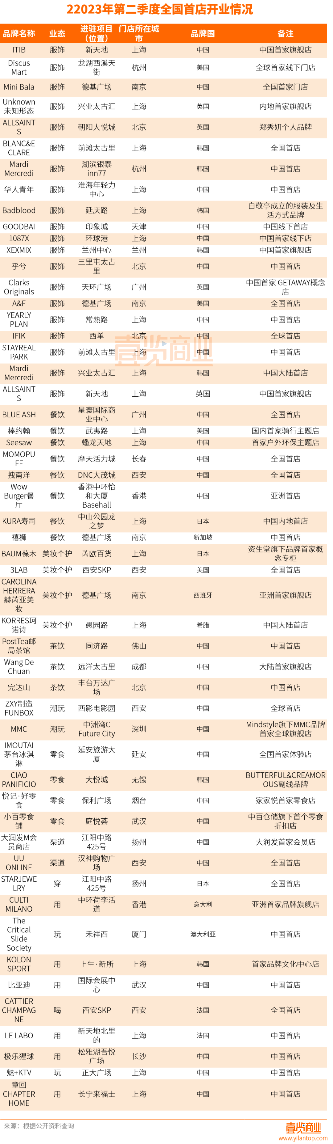 与上一季度相比,服装行业成为本季度开店主力,开店数量由8家提升至19家,其中国产品牌的频繁出现也值得我们关注,本季度19家服饰品牌中有9家为国产服装品牌,但总数依旧不敌国外品牌,此外,韩国服装品牌迎来中国首店小高潮,二季度共有5家韩国品牌宣布开设中国首店。