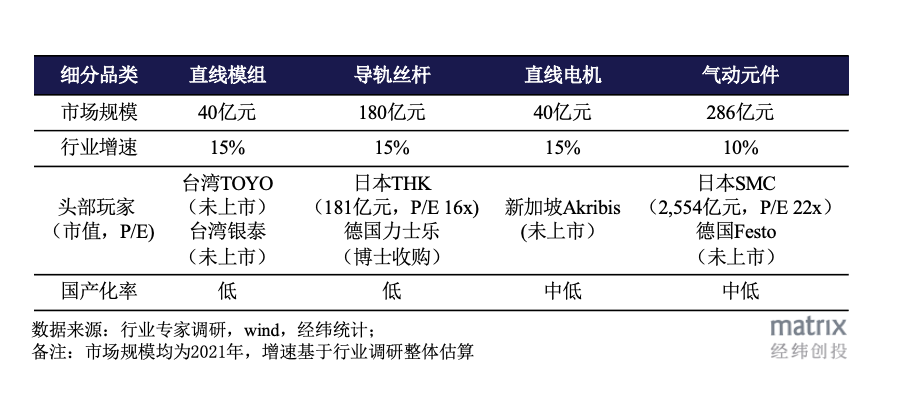 传动零部件对精密加工制造能力要求较高,日本、德国等传统工业强国在该领域积累很深,国内玩家也在快速追赶中。直线模组和导轨丝杆国内市场规模220亿元,主要被德国力士乐、日本THK、中国台湾上银、银泰、TOYO等海外及中国台湾地区玩家占据,近几年锂电、光伏、3C等行业的快速发展带动了直线模组采购量增长,推动了国产化进程。