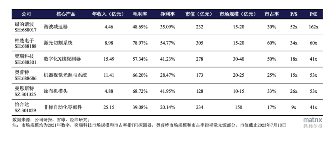 如下图所示,典型如机器人谐波减速器、涂布机模头、机器视觉光源,激光切割系统、X射线探测器等相对垂直细分市场,可切市场规模在小几十亿到百亿之间,绿的谐波、柏楚电子、奕瑞科技、奥普特、曼恩斯特等行业头部玩家收入体量也不大,年收入在几亿到十亿出头,但在各自细分领域的市占率较高,普遍在20%-60%之间,且盈利能力普遍很强,净利率能到20%-60%。从资本的角度看,这类公司科创属性强,二级市场普遍给到较高的估值倍数,P/S 10x-50x,P/E 40x-160x,资本溢价高,长期稳定市值在数百亿元。