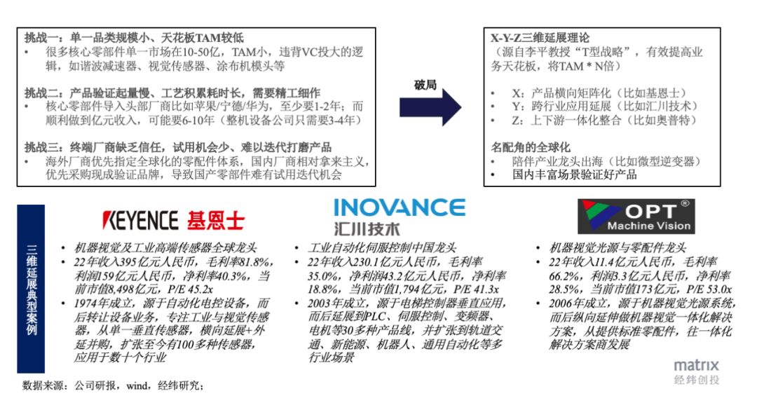 一方面,针对零部件企业面临的天花板问题,参考李平教授提出的“T型战略”,我们认为零部件公司可以通过:1)横向产品矩阵化与技术平台化、2)纵向跨行业应用延展及、3)上下游一体化整合,能有效提高业务天花板到数倍规模。而且在一线调研,我们发现不少企业都在做类似的动作,比如工控龙头汇川,基于扎实的底层技术平台,横向开发各类工业自动化部件,变频、伺服、驱动、控制、机器人等产品矩阵逐步完善,纵向从电梯行业延展到注塑、轨交、汽车、能源等众多行业,极大地提高了企业的发展天花板,22年营收突破230亿元;再比如机器视觉光源研发商奥普特,最初以视觉光源为主的业务,通过上下游整合,涉足到视觉整体方案,也很大程度突破了视觉光源小市场的局限。