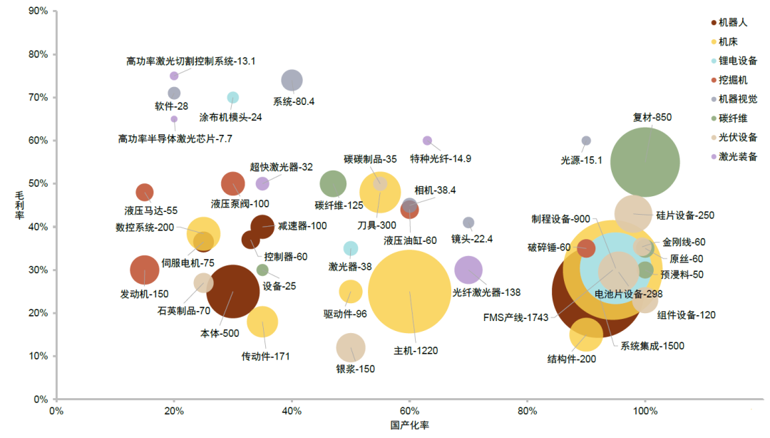 基于典型装备拆解来看,附加值较高的零部件如工控类、光电类、传动类等目前大量依赖进口,存在大量国产替代的机会;