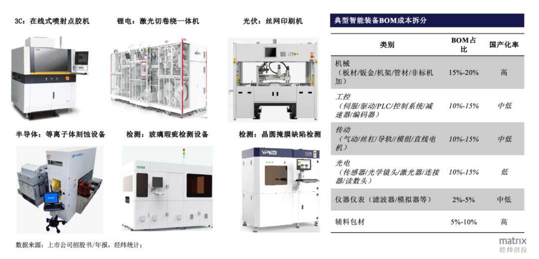 基于上市公司公开披露资料及行业调研,我们对典型行业的典型智能装备进行拆解,发现里面存在大量零部件如PLC、传感器、传动部件、减速器等依赖进口,且这些零部件的BOM成本占比相对较高。