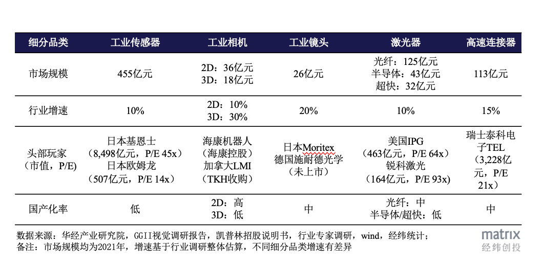 2)光电领域:光电零部件在整机设备BOM成本中占比约10%-15%,传感器、工业相机、镜头、激光器、高速连接器等都均属于典型的光电核心零部件,其中也存在大量国产替代机会。