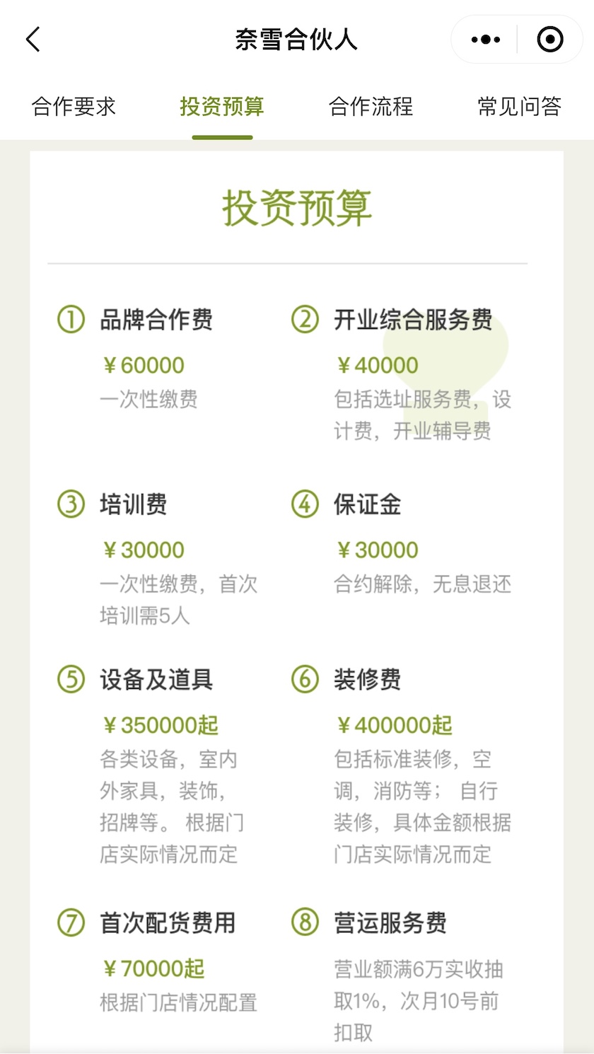 据奈雪的茶合伙人政策,其对门店面积的要求明确限定在90-170平方米范围;在投资预算方面,开一家奈雪加盟店的预算为98万元起步,其中的大头包括装修费40万起,设备及道具费35万起;人工方面,一家门店至少需要5名员工;抽成方面,奈雪规定营业额满6万实收抽1%。