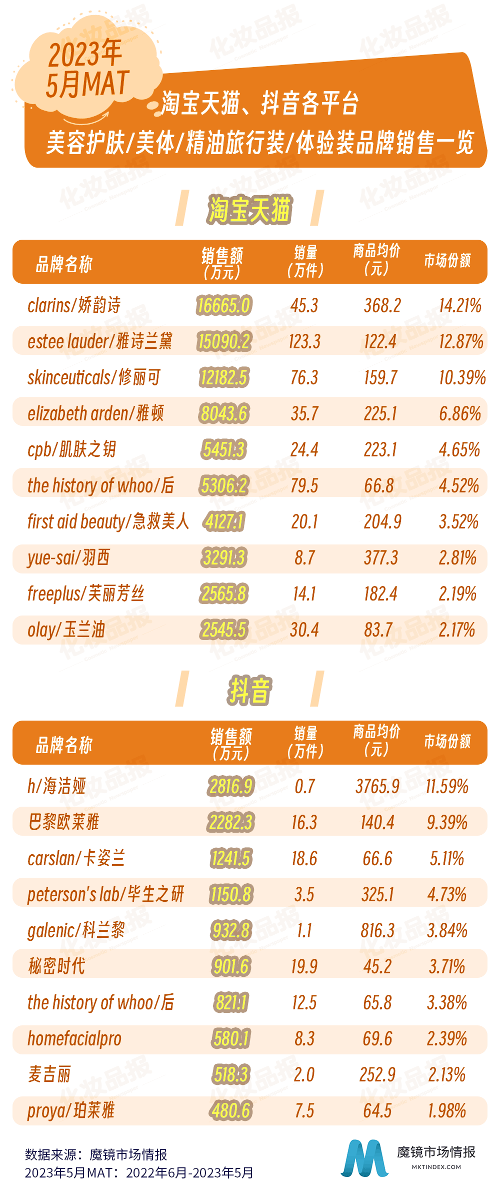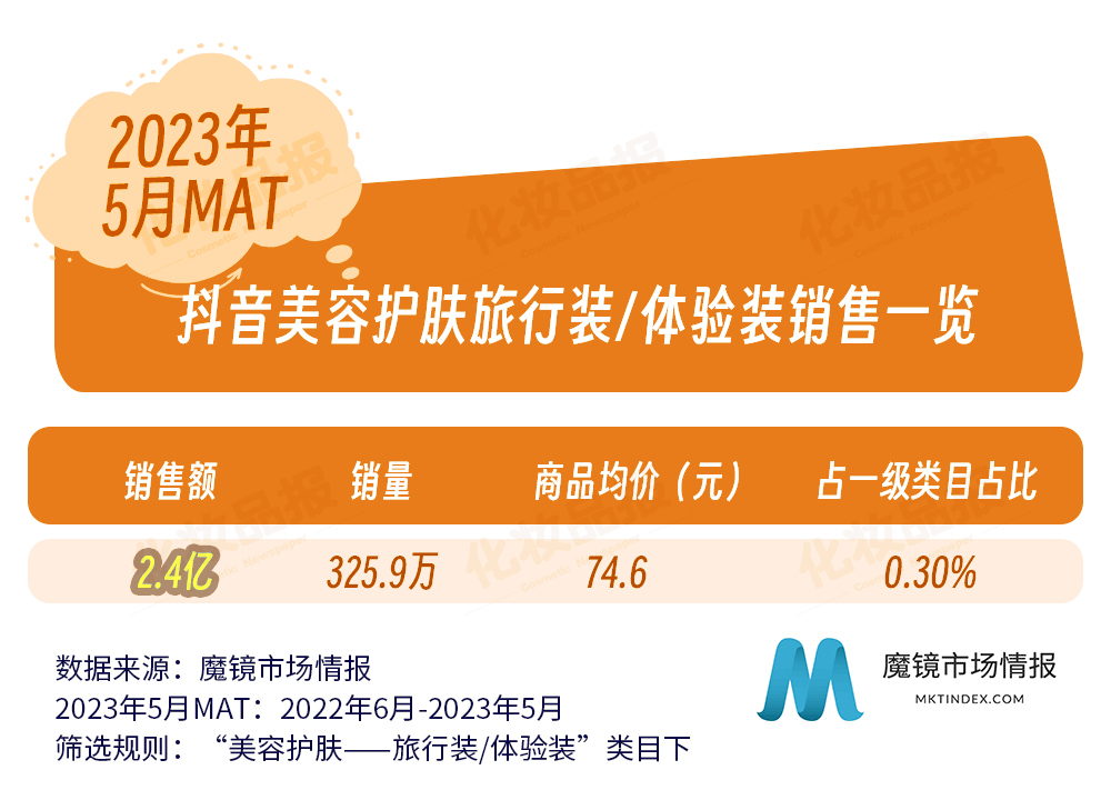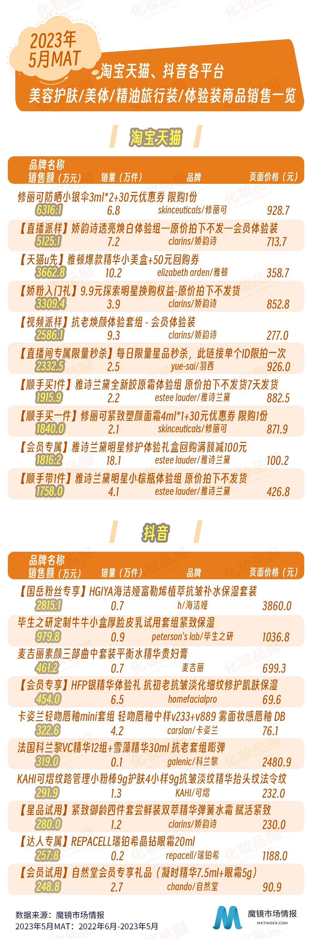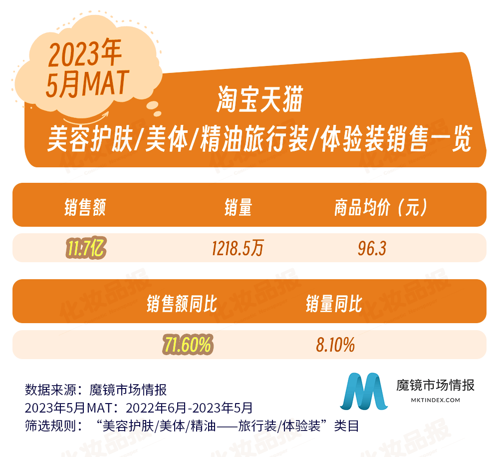 另外,2022年6月-2023年5月,美容护肤、美体、精油类旅行装/体验装在淘宝、天猫平台销售额为11.7亿元,同比增长71.6%,共售出1218.5万件,同比上升8.1%,商品均价96.3元;抖音平台销售额为2.4亿元,共售出325.9万件,商品均价74.6元。
