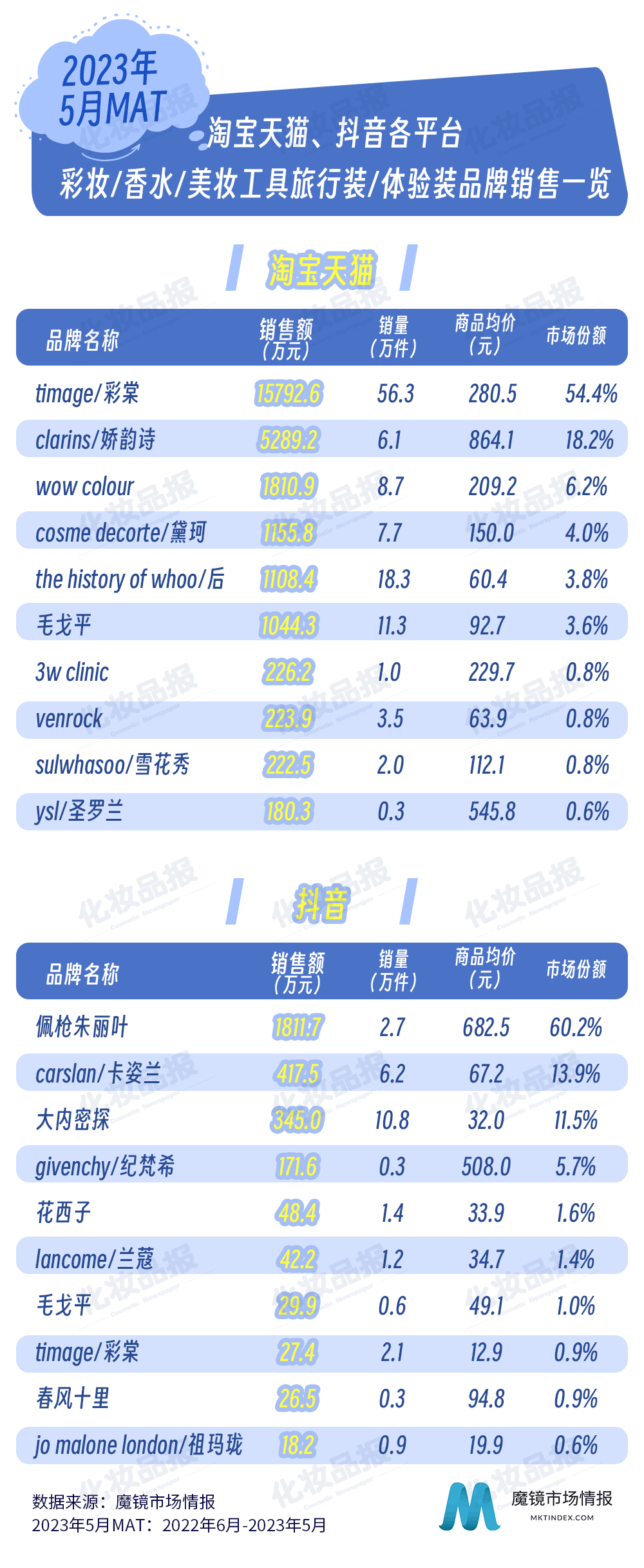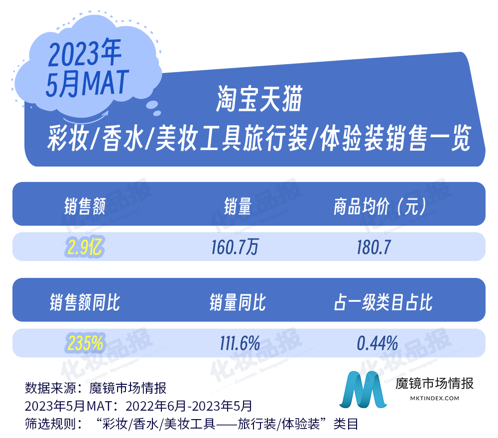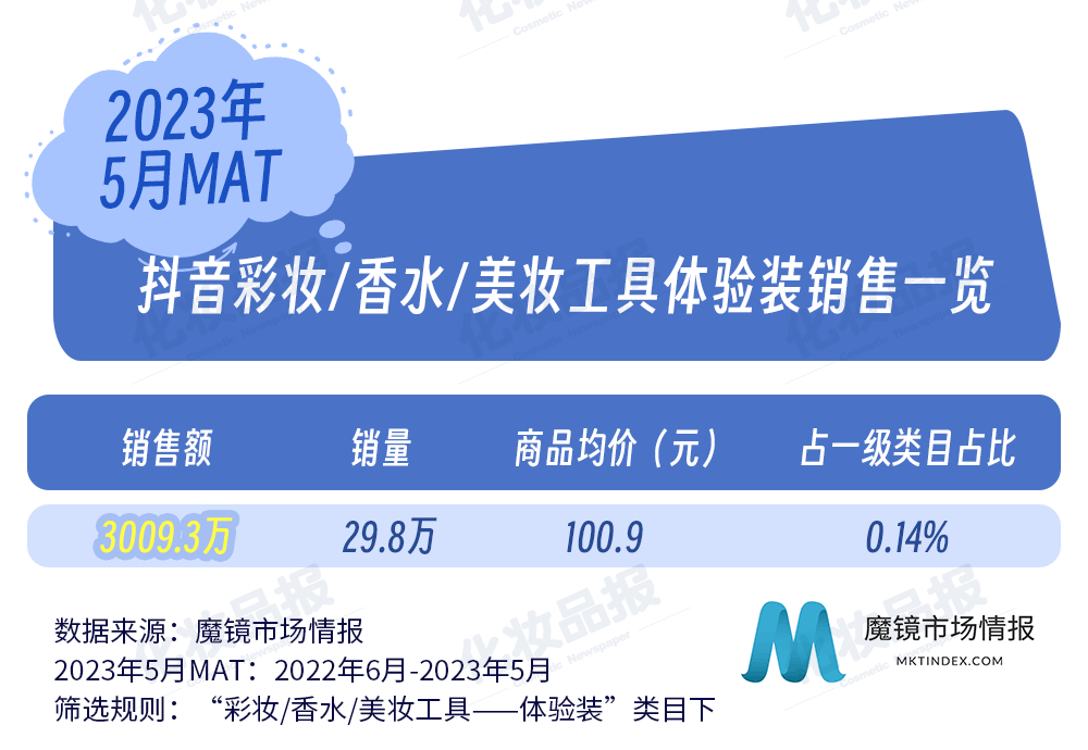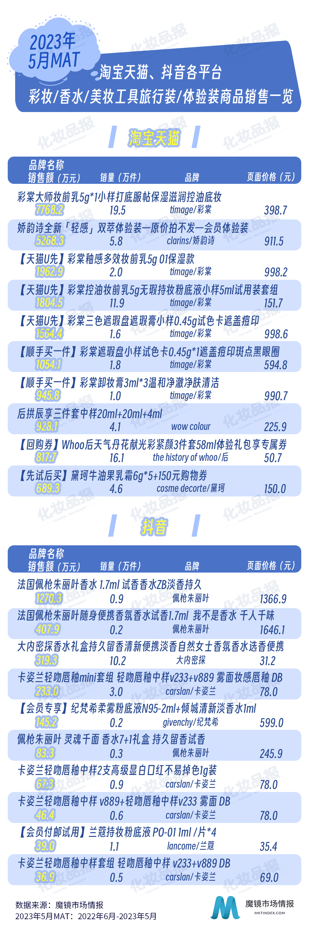 根据魔镜市场情报数据显示,2023年5月MAT(2022年6月-2023年5月),彩妆、香水、美妆工具类旅行装/体验装在淘宝、天猫平台销售额为2.9亿元,同比增长235%,共售出160.7万件,同比上升111.6%,商品均价180.7元;抖音平台销售额为3009.3万元,共售出29.8万件,商品均价100.9元。