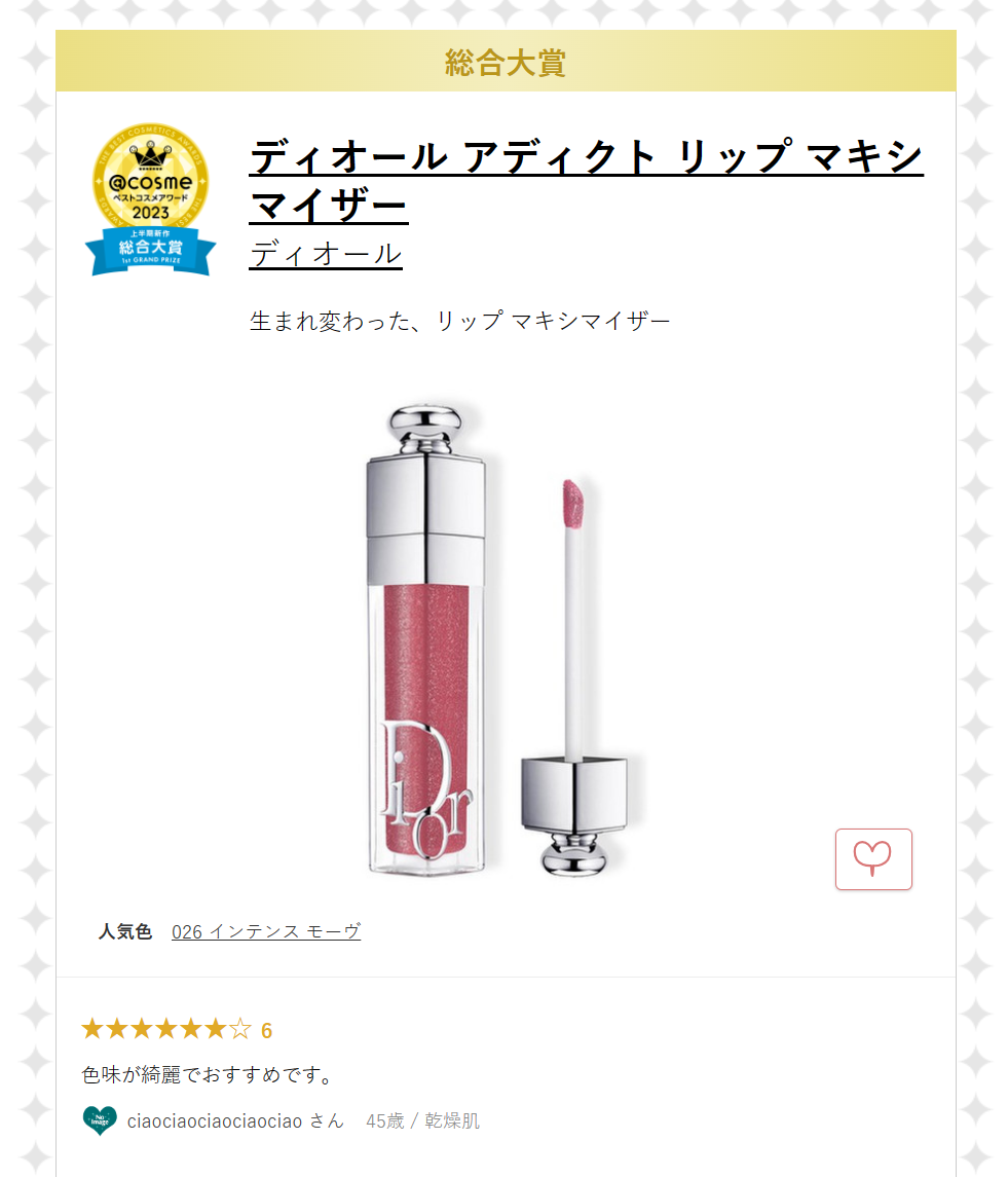 “我们注意到,过去半年内,网站内对‘丰唇’一词的搜索量比前年同期增长了210%,” @cosme 说,“各大国际品牌也开始争相推出主打保湿滋润、妆效丰盈带‘镜面感’的唇彩、唇釉类产品,该类产品能摘得本次排行榜的冠亚军也证明了这一消费趋势。”