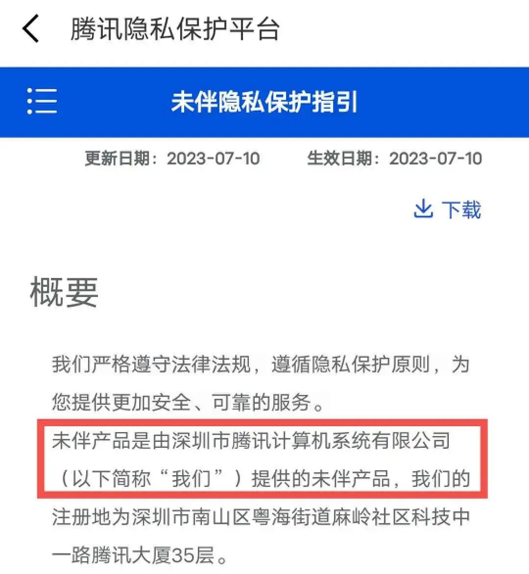 点击APP中的“隐私政策”,可跳转至腾讯隐私保护平台,并在隐私保护指引概要中写着“未伴产品是由深圳市腾讯计算机系统有限公司提供的未伴产品”的字样,印证了该产品出自腾讯。