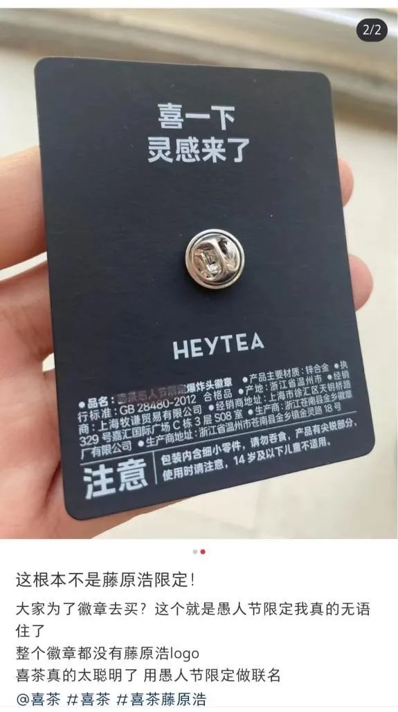 不仅如此,联名也成为很多品牌处理囤货的方式之一,甚至连周边都还残留着之前的痕迹。比如当时喜茶和藤原浩的联名刚推出,就有网友发现,在同步推出的限量徽章上印着的是“愚人节”,被质疑喜茶是把愚人节的囤货重新拿出来做联名周边。