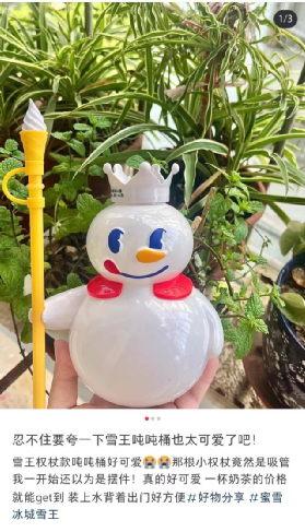 但很多联名IP由于自带文化基因,能够为茶饮品牌带新的人群与新的故事。因此以联名来提升品牌力,不断扩大自己的粉丝圈层也是品牌们需要关注的。相比其他品牌,蜜雪冰城在联名中也会更注重自己品牌IP的打造,比如此次与《蛋仔派对》的联名,推出的周边中就有雪王吨吨桶、雪王吸管、雪王公仔等。
