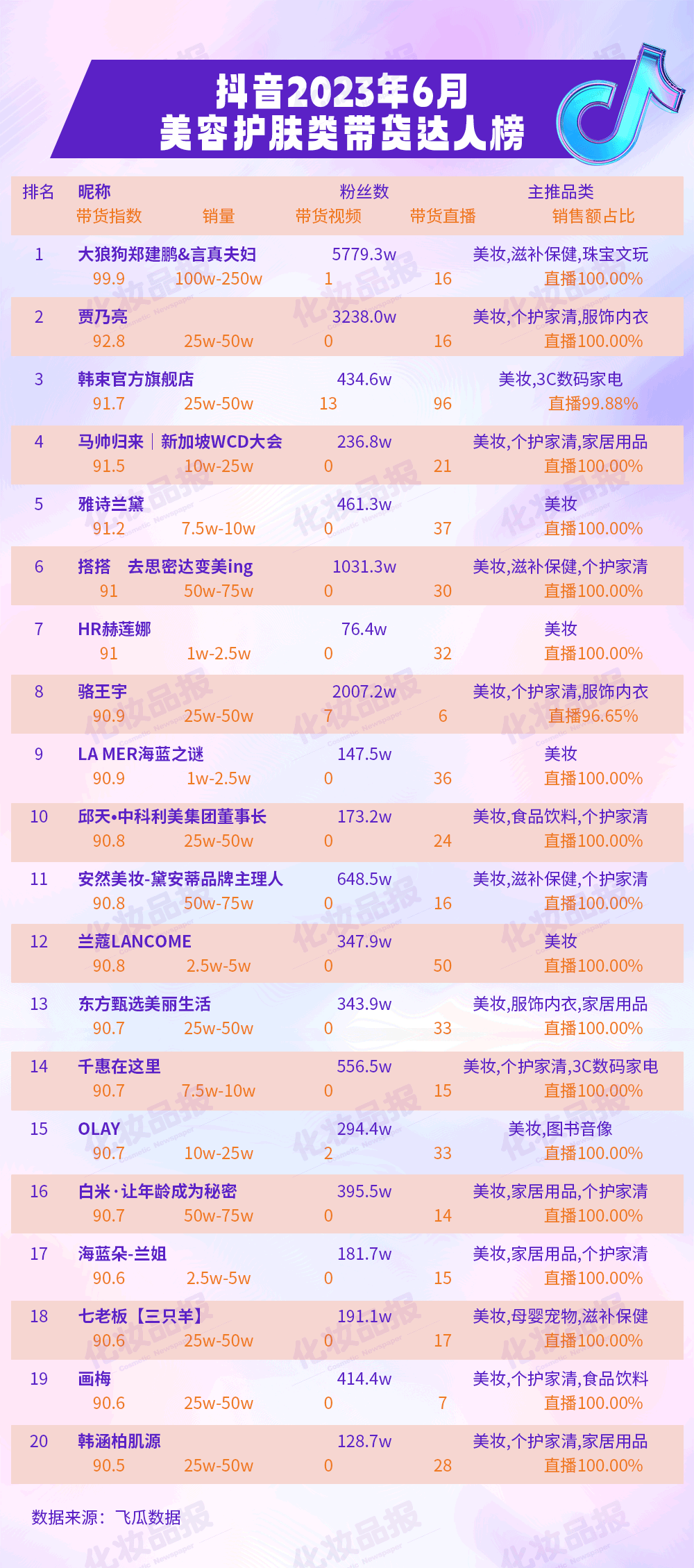 在抖音6月美容护肤类带货达人榜中,大狼狗郑建鹏&言真夫妇,也就是“广东夫妇”,以100万-250万的带货销量高居榜首,与榜单上其他达人拉开较大差距。