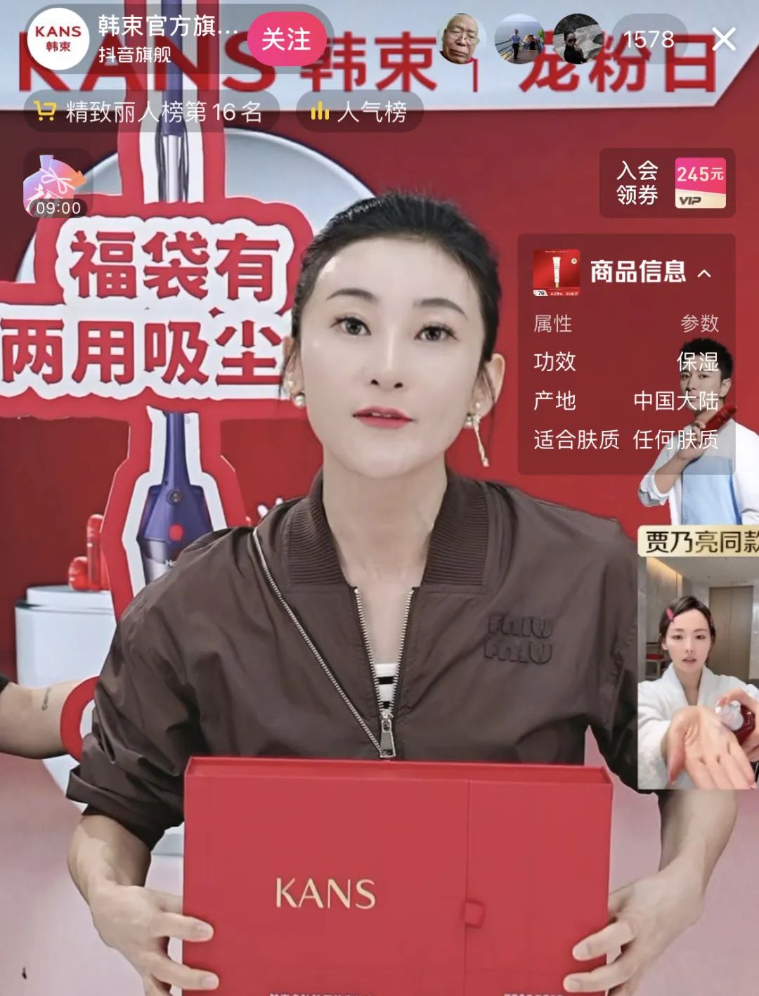 在618期间,抖音护肤品带货第二名的贾乃亮同样送出2105台苹果手机,带货爆款也多为大牌,如郝莲娜黑绷带面霜、兰蔻菁纯三件套,一度以“吓得兰蔻品牌方直接跑路”为营销卖点。据“贾乃亮的宝藏屋”,618期间贾乃亮直播间总销售额破3.53亿元,总销量153万。