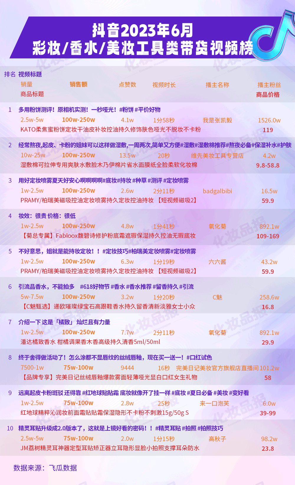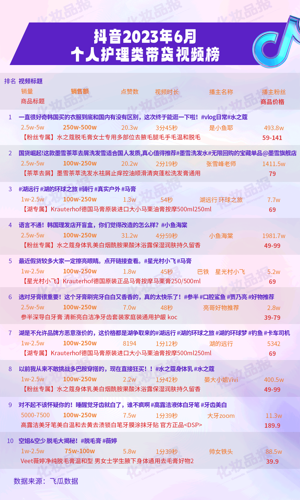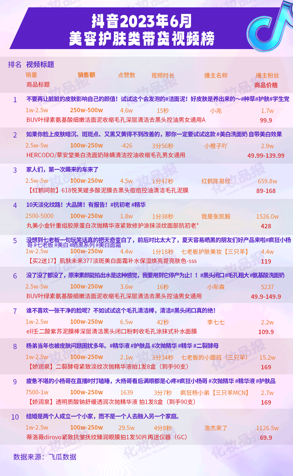 可以看到,拍摄短视频带货的播主,与主流带货主播并不重叠。6月,抖音美妆护肤类带货视频榜的第一名来自1.7万粉丝的小兆,一条15秒的带货视频成为现象级爆款,BUV叶绿素氨基酸细嫩洁面泥销售额达到250万-500万元。粉丝2.9万的小橙子吖为草安堂美白洗面奶带货,排名第二。粉丝659.8万的红鹤陈易欣,可算是“老派美妆博主”,拍摄了1分47秒的带货视频,位列护肤品带货榜的第三位。