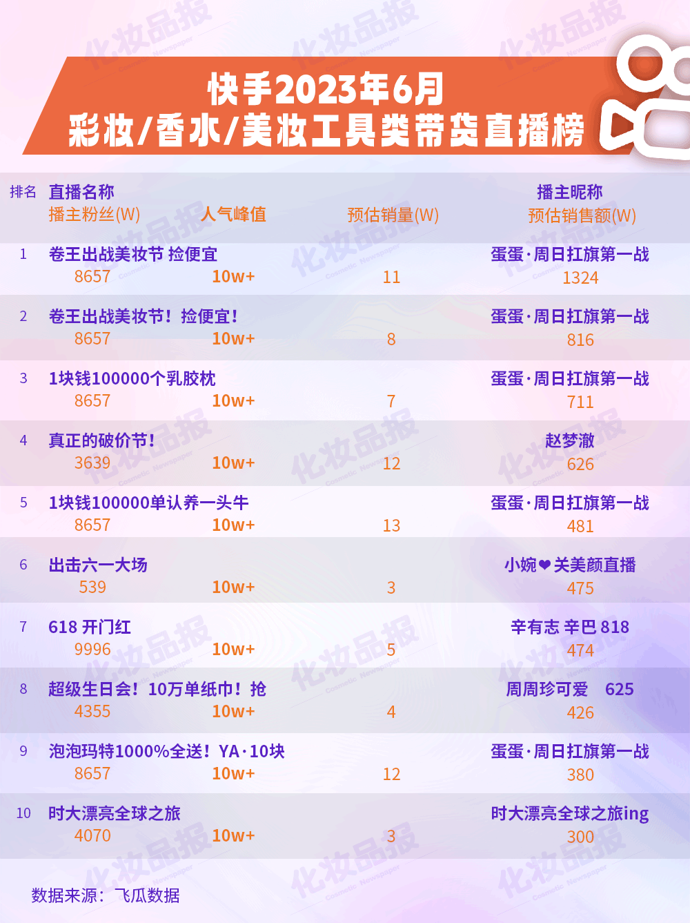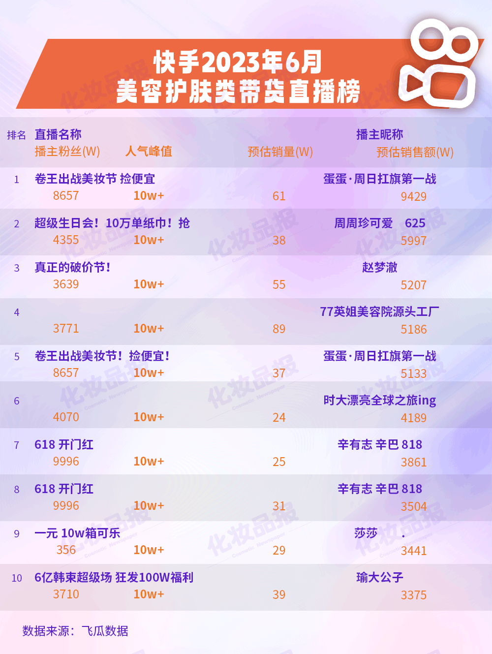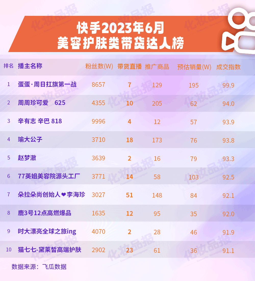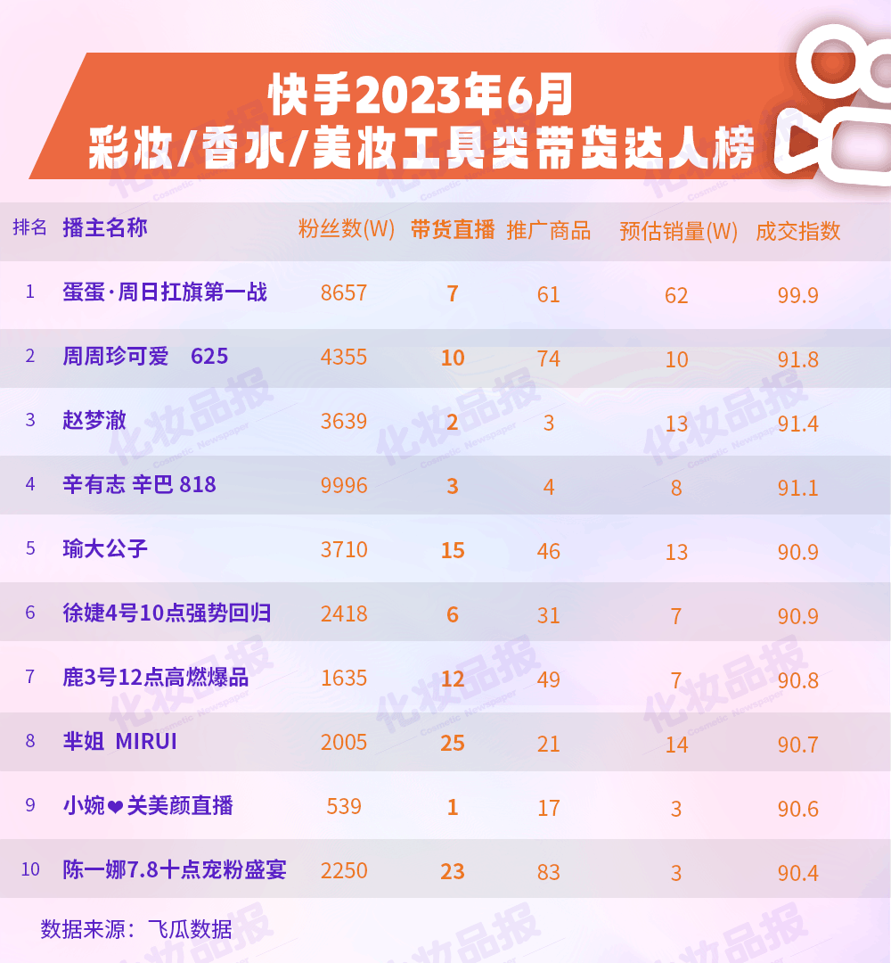 然而,飞瓜数据6月抖快带货达人榜表明,人们想象中的“顶尖带货达人”,很多已经不是达“人”了,这个荣誉给到的是品牌与团队。与此同时,短视频博主接商广已有明日黄花之境,但一些国货借此发力,仍取得了不错的成绩。快手平台仍是辛选集团的地盘,在这个变化莫测的时代,辛选二三代主播们带给化妆品从业者难得的安稳感。