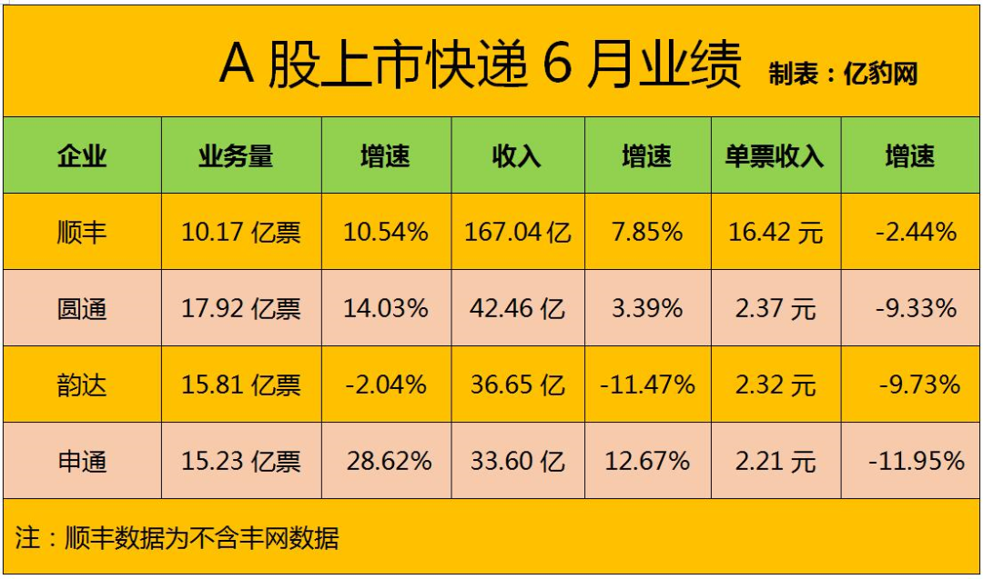 在6月电商旺季,圆通继续稳健增长,申通增速环比放缓,韵达同比小幅下滑,顺丰在甩掉丰网包袱后,继续保持增长态势,上半年利润创上市以来新高。
