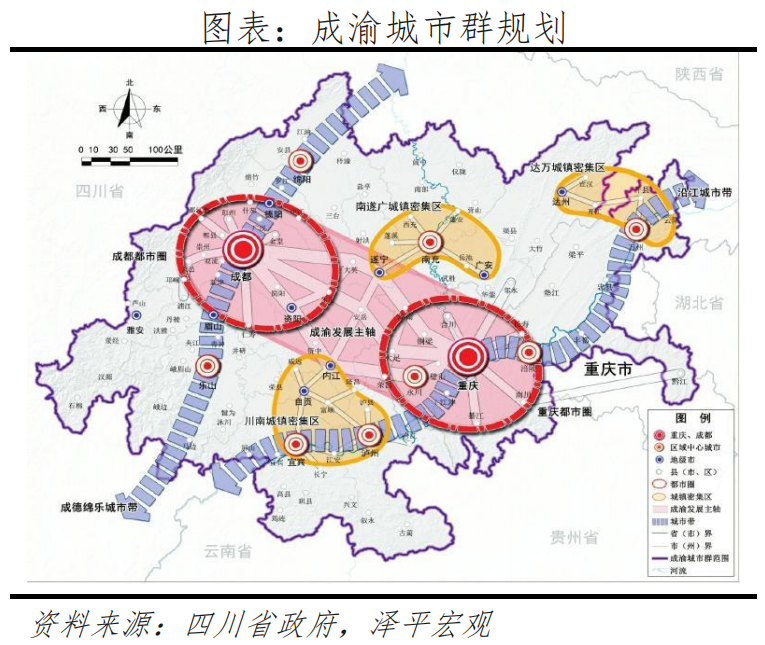 此外,“成渝经济圈”也助力了重庆新能源汽车集群发展。根据《成渝地区双城经济圈建设规划纲要》(以下简称《纲要》),成渝双城经济圈总面积18.5万平方公里,2019年常住人口9600万人,地区生产总值近6.3万亿元,分别占全国的1.9%、6.9%、6.3%,是我国西部人口最密集、产业基础最雄厚、创新能力最强、市场空间最广阔、开放程度最高的区域,在国家发展大局中具有独特而重要的战略地位。