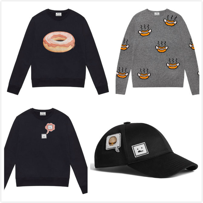 更多奢侈品牌选择直接把颜文字印到产品中。Acne Studio选了甜甜圈、香蕉、麦克风、热狗、方脸等好玩的图案印在T恤、帽子、卫衣和帽T上。原创电商Betabrand更有趣了,它做过一种暖色调印花,但凑近看会发现是由便便表情变成的。