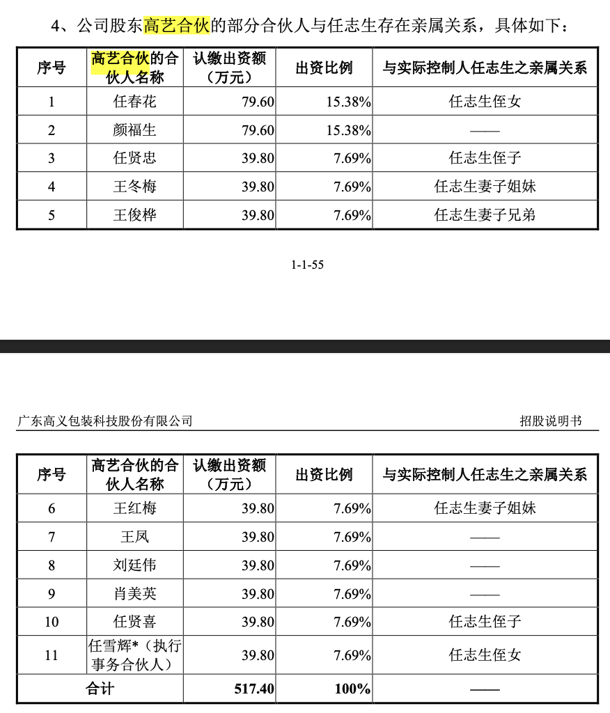 界面新闻记者注意到,高艺合伙的合伙人主要为任志生的亲属及朋友,具体名单如下,其中任贤忠担任公司经理,任贤喜担任公司科长,两人还分别认缴员工持股平台高萍合伙20万元、10万元的出资额,出资比例分别为2%、1%。