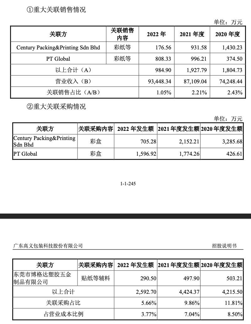 关于公司为何向前述两名关联方存在重大关联交易,高义包装解释称,应主要客户供应链区域调整要求,公司需要在东南亚地区(马来西亚和印度尼西亚)等地区进行彩盒等产成品的交付。在公司海外工厂尚未形成规模前,决定拆分生产流程,彩纸等半成品在高义包装生产,高义包装将彩纸以市价销售予境外的生产厂商Century Packing&Printing Sdn Bhd和PT Global,由该等厂商采购其他原材料并对彩纸进行进一步加工,制成成品后销售给公司在东南亚当地的贸易型子公司,并进一步销售给主要客户在附近区域的工厂。