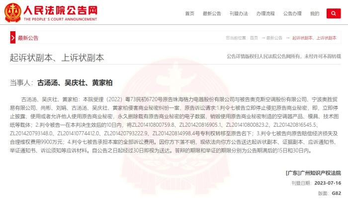 7月16日,广州知识产权法院对外公开的信息显示:近日,珠海格力电器股份有限公司向广州知识产权法院提起诉讼,控告奥克斯空调股份有限公司等七被告侵害其商业秘密,并要求赔偿9900万元。