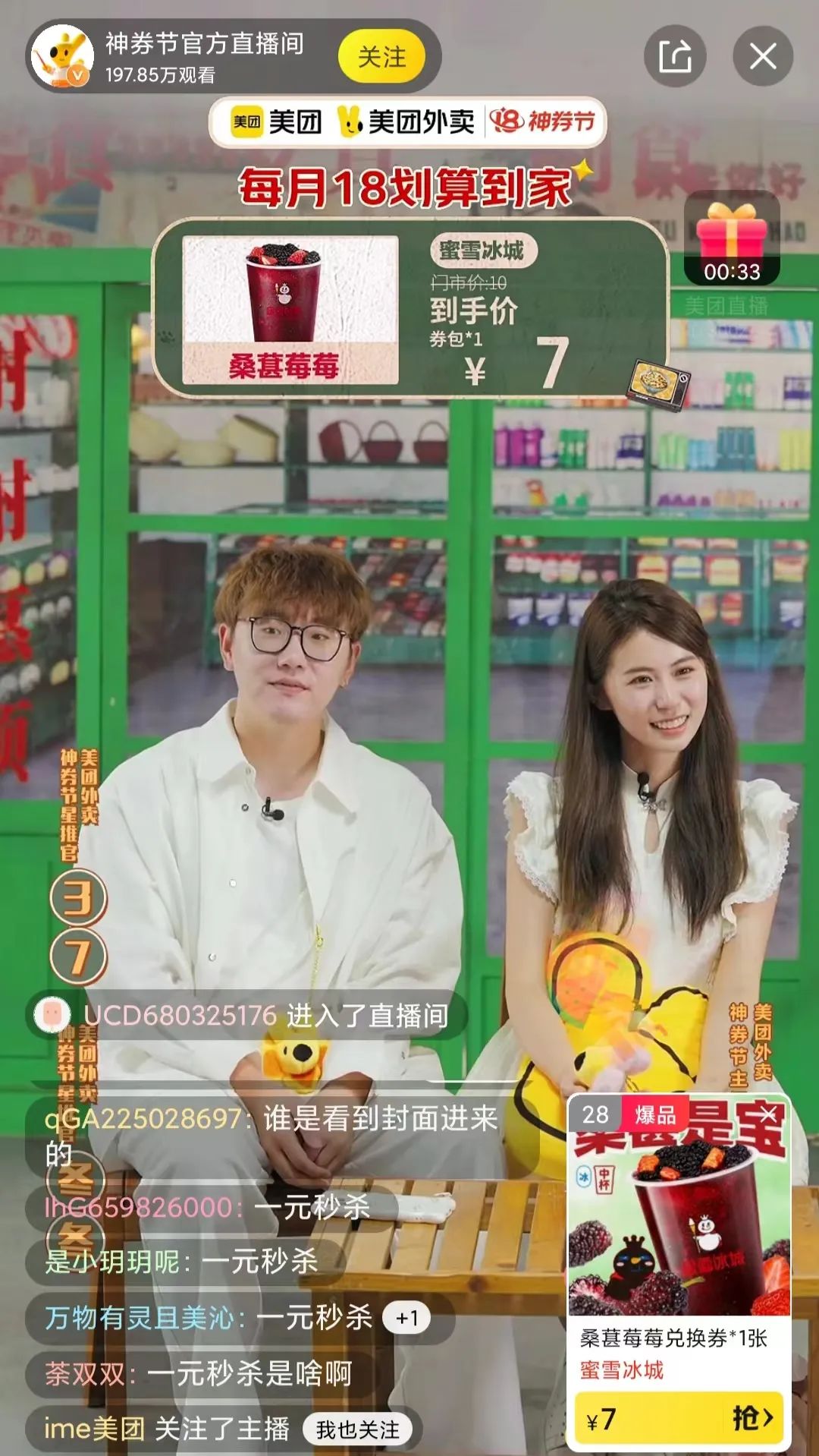 不只价格够低,品质也够硬,目前美团直播间内多是蜜雪冰城、瑞幸、肯德基等大牌商家的身影。