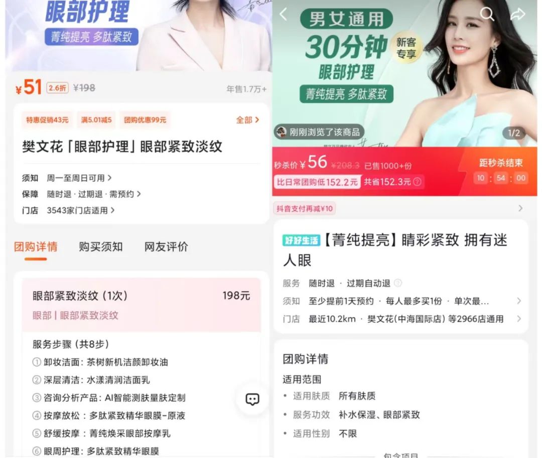 而经过抽样盘点发现,美团官方直播间内的低价折扣产品多是美团独家,在抖音没有,同时,商家美团自播间的套餐内容普遍与抖音不同,但同一套餐的价格会比抖音便宜一些,比如某连锁蛋糕店6寸榴莲千层蛋糕的美团外卖价格为119元,抖音团购为128元;面部护理品牌樊文花的眼部护理套餐的美团直播价格为51元,抖音直播为56元……
