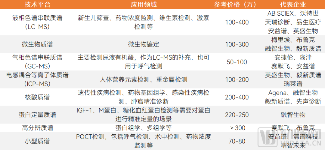 质谱检测是一个广泛的概念,可分为多个技术类别,多个应用领域,在临床应用较为广泛的质谱技术包括LC-MS、微生物质谱、核酸质谱、ICP-MS、GC-MS谱,小型质谱等也在逐渐步入临床。