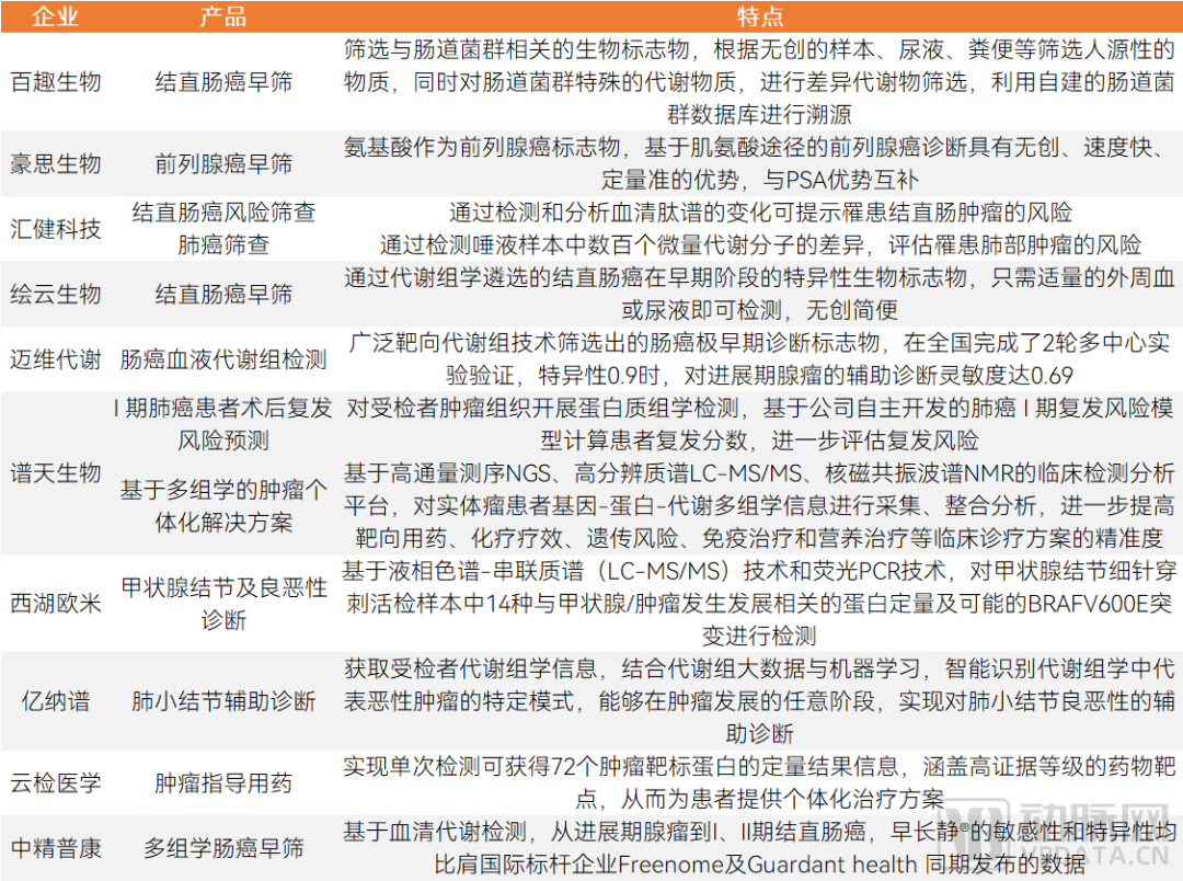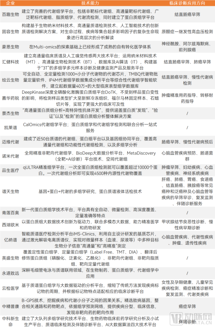 多组学临床应用上,以蛋白质组学和代谢组学为代表的多组学能够展现病理表现背后的分子变化,极大地拓展潜在的疾病标志物种类,但这些标志物的特异性和稳定性还有待检验,目前成功临床应用的多组学产品极少,有少量企业走在了前列。