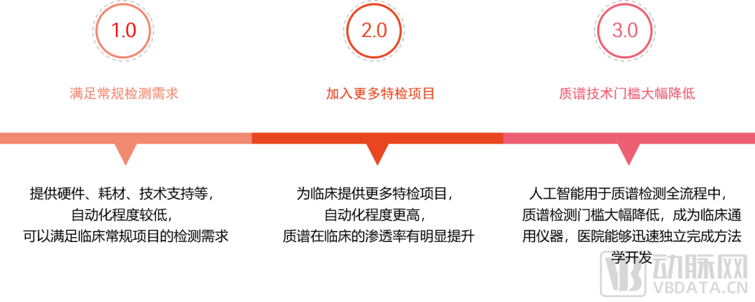 目前基于LC-MS的临床质谱一站式解决方案正处于1.0阶段,正在向2.0阶段过渡。可以将一站式解决方案分为三个阶段。1.0阶段,厂商为医院提供硬件、耗材、软件、技术支持,主要聚焦于常规检测应用提供服务;2.0阶段,厂商的服务范围进一步扩大,在特检项目上为医院提供更多支持;3.0阶段,仪器更通用,人工智能技术渗透到质谱全流程中,医院开展质谱检测的门槛大幅降低,能够应用质谱仪迅速开发方法学。