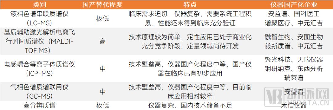 LC-MS作为临床质谱最核心的仪器,国产替代程度极低,MALDI-TOF MS仪器国产替代最成熟,ICP-MS仪和GC-MS仪国产程度较高。