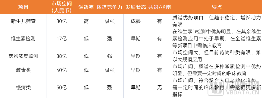 我们一般将LC-MS目前正在应用的临床项目称为常规应用,核心逻辑是对传统方法学进行替代,升级为质谱方法学。这些常规应用有新生儿筛查、维生素检测、药物浓度监测、激素类检测、慢病类检测,各个应用在临床的渗透率不同,市场空间不同,竞争格局不同,呈现出了不同的情况。
