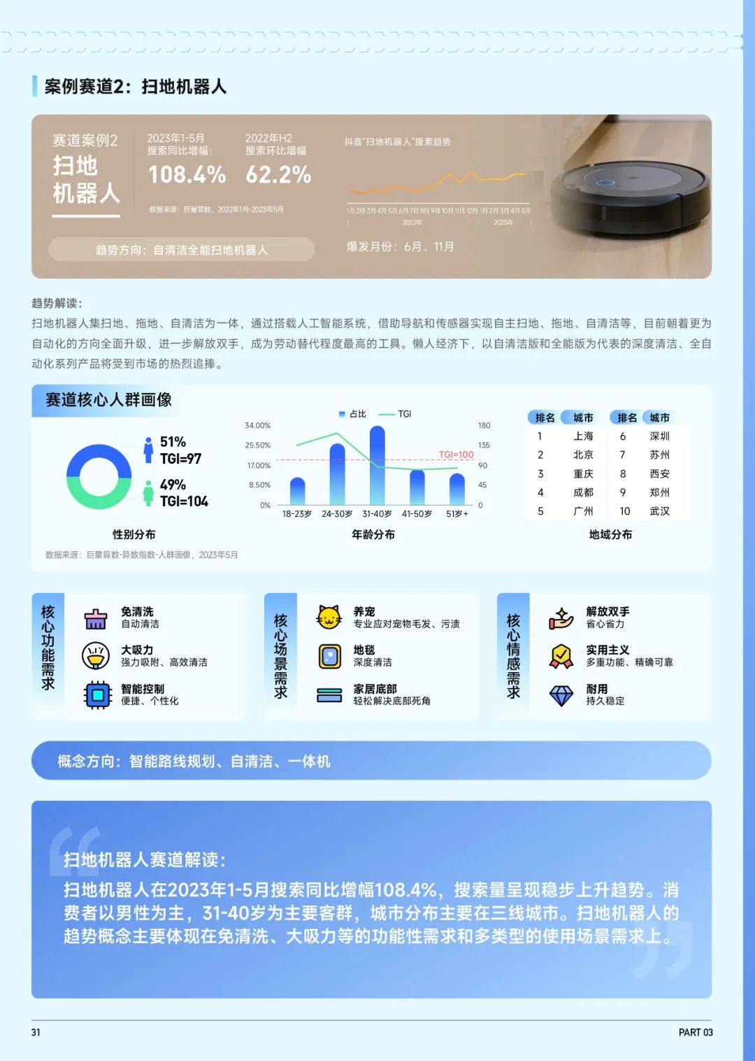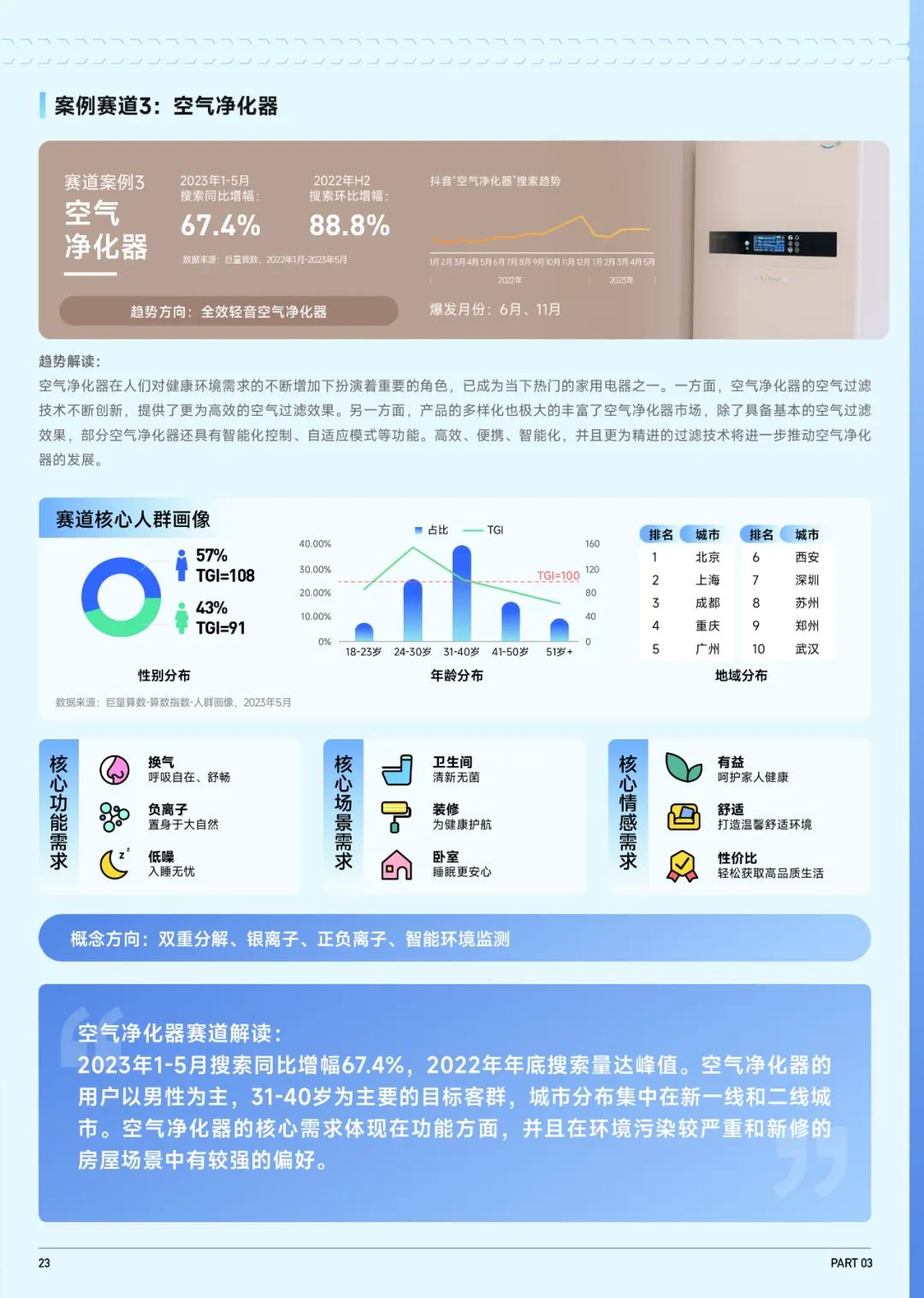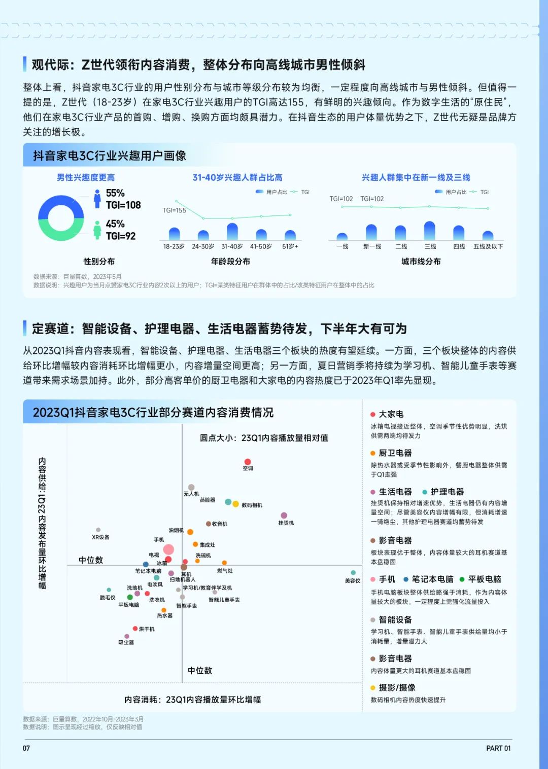 奥维云网(AVC)联合巨量算数&算数电商研究院发布《2023年抖音趋势赛道名片 | 家电 3C 行业专刊》,结合行业洞察与赛道挖掘,总结出“空间魔术”“赛博康养”“科技随行”“智享生活”四大主题风向,以及相关的 46 个高潜趋势赛道。报告显示:在2023年消费逐渐理性复苏的良好态势下,家电3C行业的线上市场延续韧性增势,从行业回暖态势来看,各品类仍存在分化。存量型品类市场中有较为温和的复苏体现,部分季节性品类呈现较高速的修复。分渠道看,线上渠道仍然在复苏态势上呈现一定的引领性,部分品类线下市场也呈现较为强劲的复苏状态。