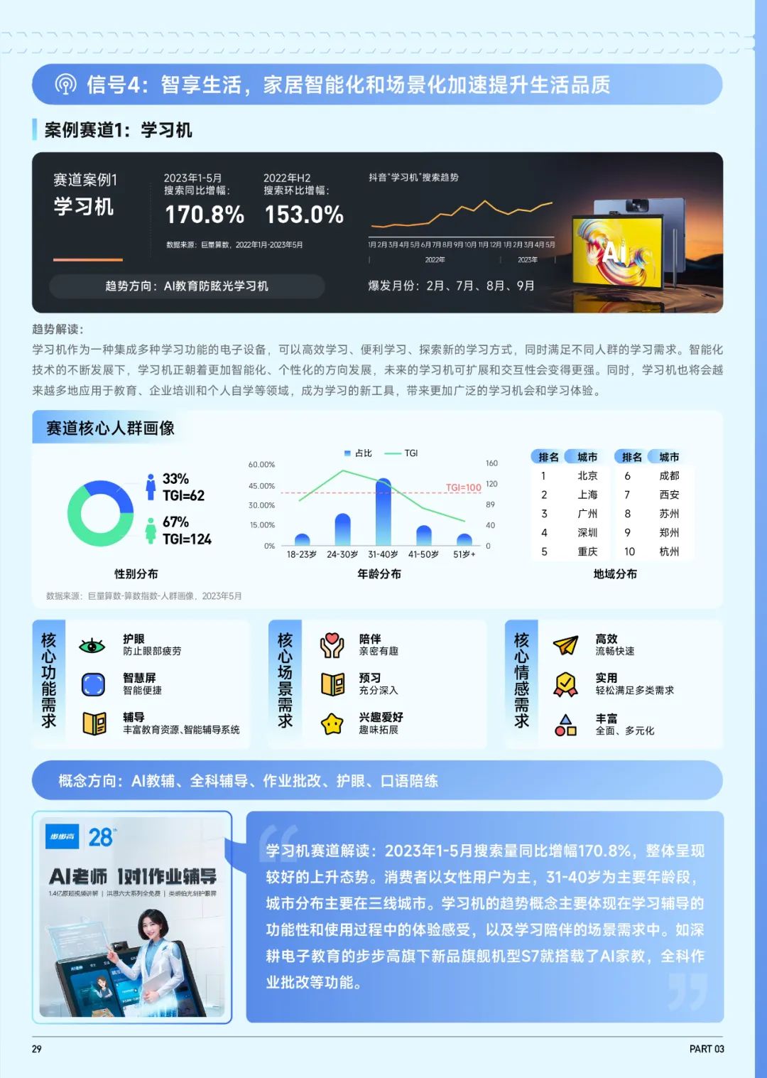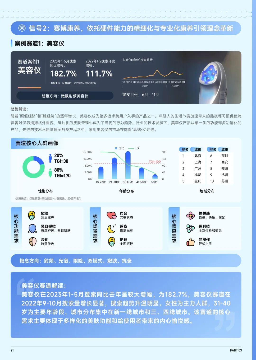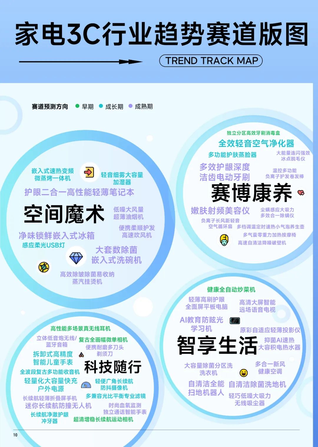 以早期、成长期和成熟期三类生命周期的划分标准下,各板块的品类皆迸发出多样化的发展趋势,呈现出更多的可能性。结合案例进一步分析,以及赛道核心人群的画像描绘,对趋势赛道信号有了深层次的解读和提炼。