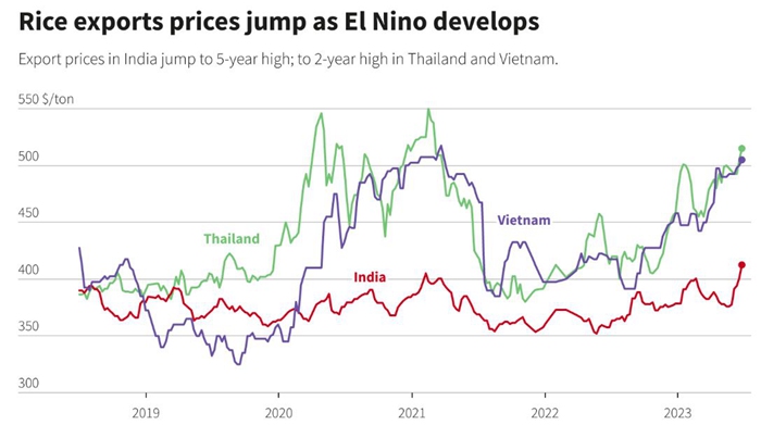 印度、泰国和越南是全球三大大米出口国。路透社统计显示,由于各国为应对厄尔尼诺现象而囤购大米,泰国和越南的大米出口价格已经涨至2021年以来的最高,双双超过每吨500美元。越南5%破碎率大米出口价升至每吨515美元到525美元,为2011年以来最高。