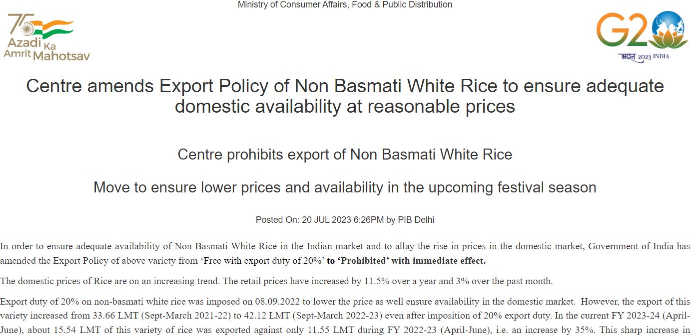 7月20日,印度政府宣布从即日起禁止除巴斯马蒂大米之外的白米(Non Basmati White Rice)出口,该种类占印度大米出口的25%。
