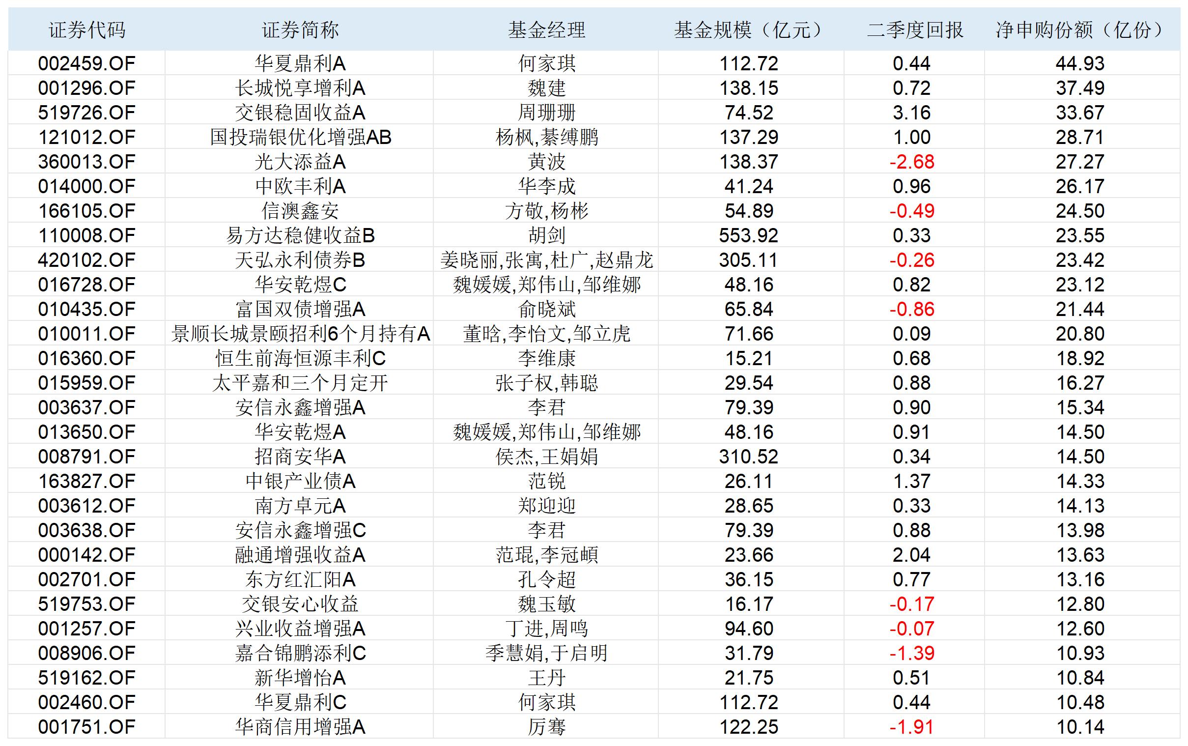 二季度,435只“固收+”(混合债券型二级基金、偏债混合基金)获得净申购。其中28只“固收+”净申购份额超10亿份。华夏鼎利、长城悦享增利、交银稳固收益等多只基金净申购份额靠前。