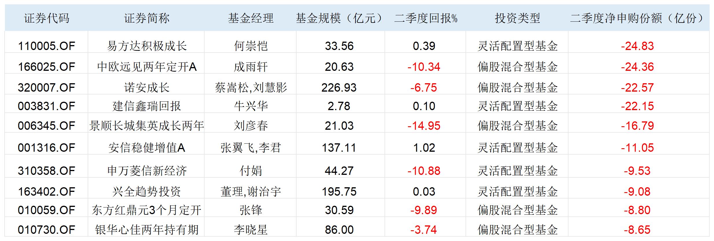 蔡嵩松和刘慧影共同管理的诺安成长混合期内净赎回了22.57亿份,净赎回比例达11.87%;刘彦春管理的景顺长城集英成长两年定开的净赎回份额也居前,达16.79亿份,净赎回比例达48.74%。