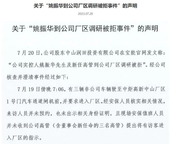 7月20日,中炬高新发布关于“姚振华到公司厂区调研被拒事件”的声明,称因为“来访人员并未预约”。