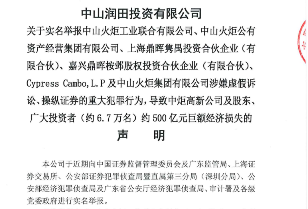 中山润田在举报声明中直接向火炬集团阵营开火,点名中山火炬工业联合有限公司(简称:工业联合公司)、中山火炬公有资产经营集团有限公司(简称:中山火炬)、上海鼎资合伙企业(有限合伙)、嘉兴鼎股权投资合伙企业(有限合伙)、Cypress Cambo, L. P.和火炬集团6家公司。