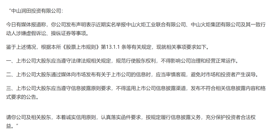 上述举报声明发布当晚,上交所监管工作函紧随其后,要求中山润田及相关股东,本着诚实信用原则,认真落实函件要求,按规定履行信息披露义务,充分保护投资者合法权益。